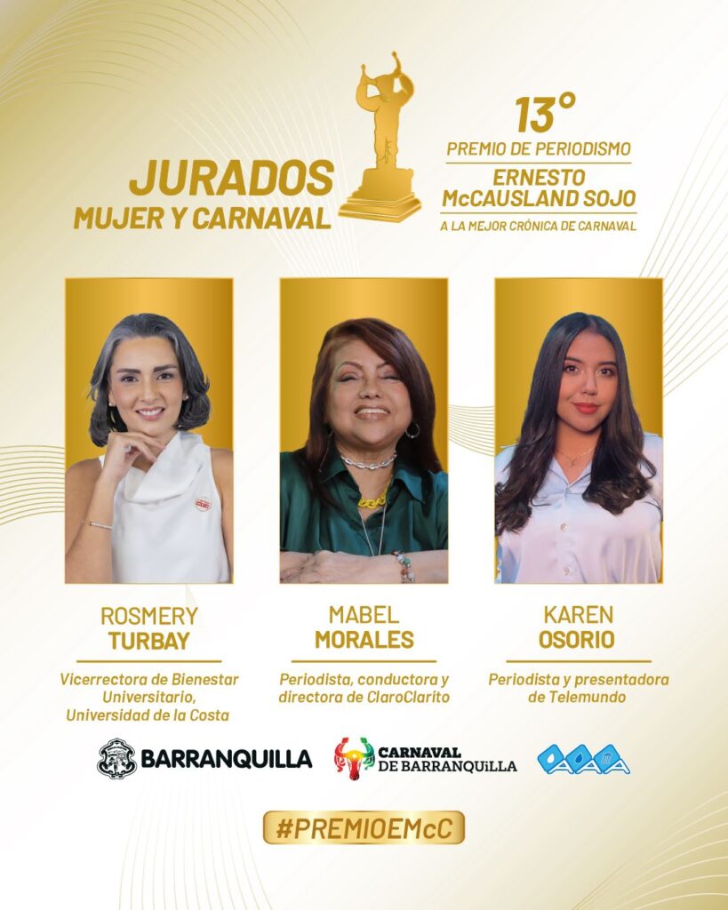 En Mujer y Carnaval, los jurados serán Rosmery Turbay, vicerrectora de Bienestar Universitario de la Universidad de la Costa abogada, con más de 15 años de experiencia en Gestión Institucional, es Executive MBA y magíster en Derecho Público, miembro del círculo de Mujeres de la Revista Semana; la periodista Mabel Morales, comunicadora social con maestría en Ciencias Políticas y Económicas gran trayectoria informativa en en el Caribe y directora del medio Claro Clarito, creadora del colectivo Tertulias de Mujer; y Karen Osorio, periodista, presentadora y reportera digital de Telemundo en Las Vegas.