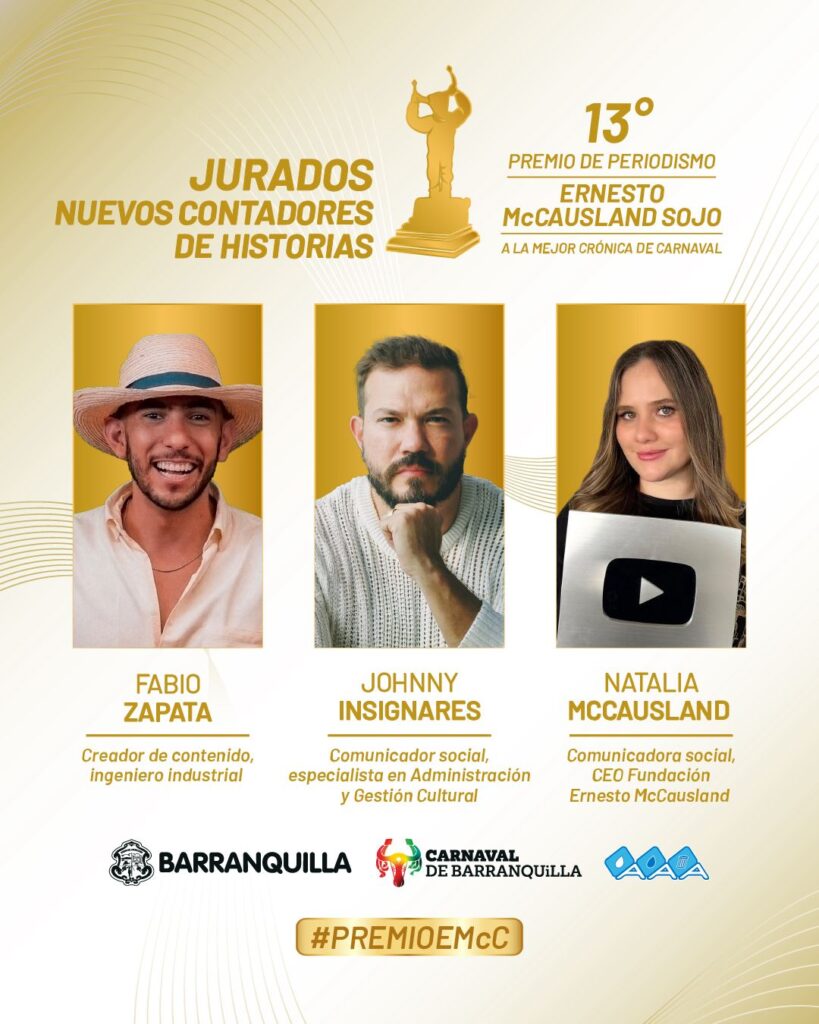 Como gran novedad, la edición 2026 incorpora la categoría Nuevos Contadores de Historias, dirigida a estudiantes de Comunicación Social y Periodismo que narren el Carnaval a través de TikTok e Instagram. El jurado estará integrado por Johnny Insignares, comunicador social y especialista en gestión cultural dedicado a divulgar el patrimonio arquitectónico de la ciudad; Fabio Zapata, creador de contenido gastronómico y autor de la cuenta Viajero con Sabor, con más de 465 mil seguidores en Instagram; y Natalia McCausland, comunicadora social y directora de la Fundación Ernesto McCausland.