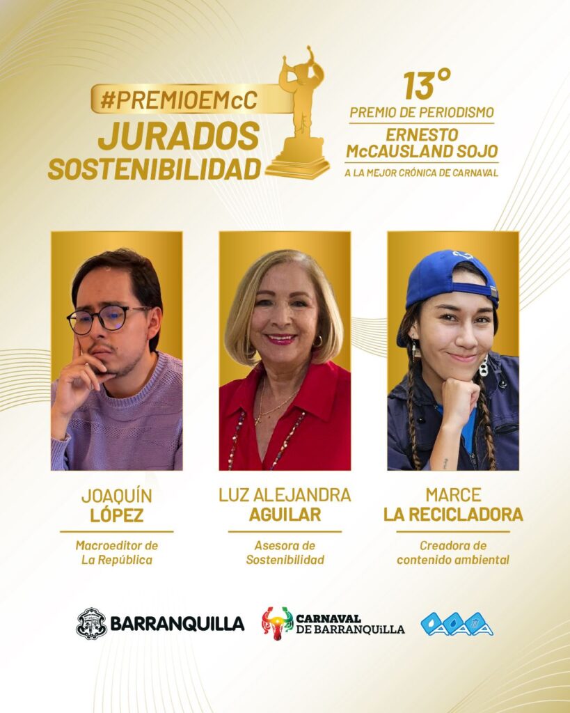 La categoría Sostenibilidad contará con Luz Alejandra Aguilar, comunicadora social y asesora en sostenibilidad, quien lideró durante años la Dirección de Operaciones del Carnaval; Joaquín López, macroeditor del diario económico La República y especialista en gerencia y gestión cultural; y la creadora de contenido Sara Samaniego, conocida como Marce la Recicladora, directora creativa de la agencia MyCreateam y cofundadora de la Fundación Reciclamores, desde donde impulsa iniciativas para mejorar las condiciones de vida de recicladores en Colombia.