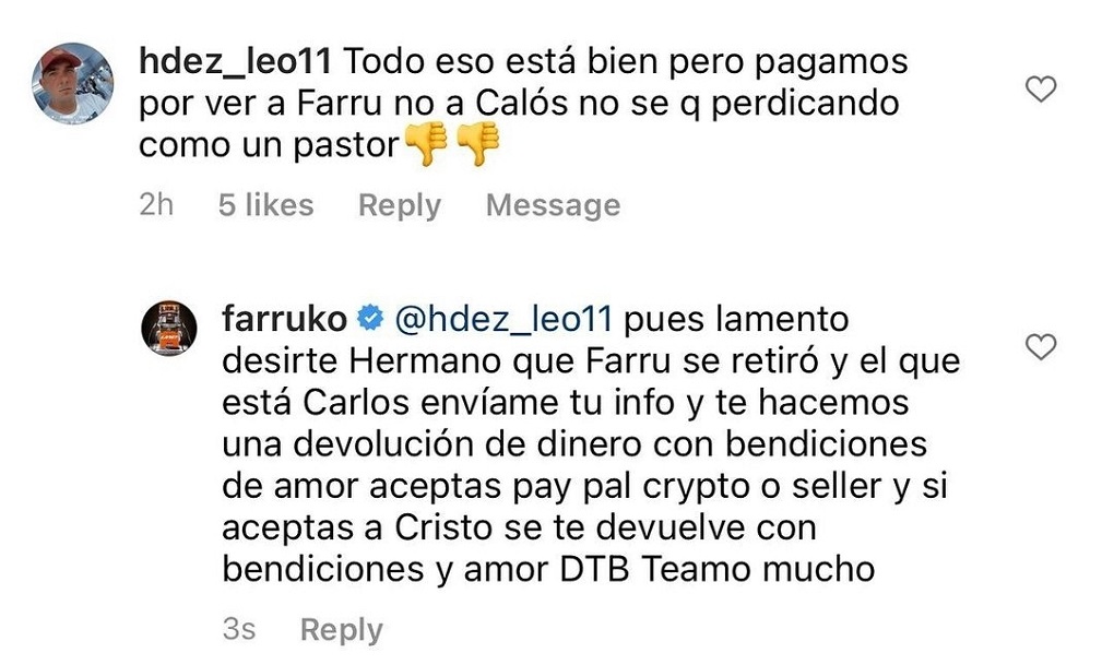 Sin embargo, sus publicaciones también han sido criticadas por quienes lo admiraban y hasta reclamos le han hecho debido a que no les ofreció el show por el que pagaron ver en Miami, a lo que él ha respondido tajantemente: “Farru se retiró y el que está es Carlos”.