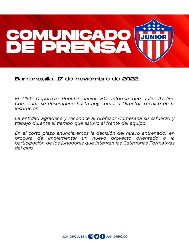 El final de ‘Julio X’ estaba más que escrito por los malos resultados que ha tenido con Junior de Barranquilla, principalmente, en los últimos juegos tanto por Copa Colombia, donde perdió en la final con Millonarios, y en los cuadrangulares finales, donde es último en su Grupo A y está un 90% eliminado en sus aspiraciones de ir a la final. Lo que no estaba redactado era que su salida iba a ser antes de lo previsto, la cual fue anunciada por el club la mañana del jueves 17 de noviembre.