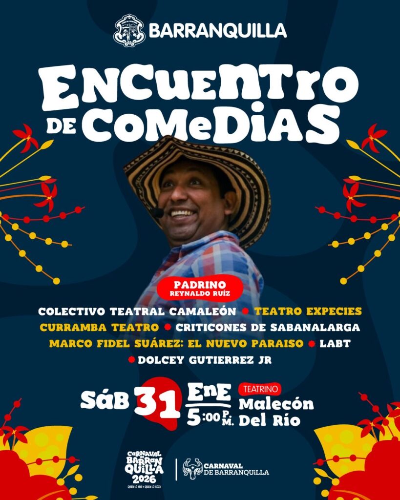 A partir de las 5:00 p. m., en el mismo escenario, se dará inicio al Encuentro de Comedias, con la participación de los colectivos Camaleón, Teatro Expecies, Curramba Teatro, Criticones de Sabanalarga, Marco Fidel Suárez y LABT, teniendo como padrino al reconocido cuentero Reinaldo Ruiz. Antes de bajar el telón, el público disfrutará de la presentación musical de Dolcey Miguel Gutiérrez, con un repertorio musical cargado de sabor carnavalero.