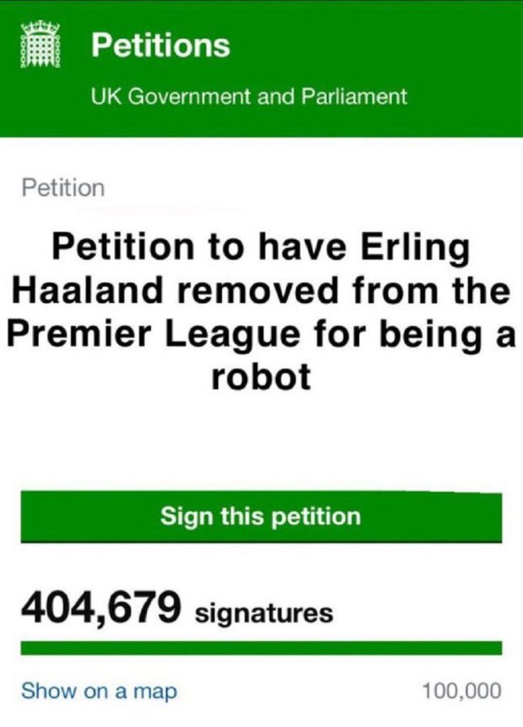 Tan “orates” sensaciones que deja el atacante de 22 años llegó hasta el punto de que, en los últimos días, en ese país nació un movimiento en las redes sociales en el que recogían firmas para que “Haaland deje de jugar la Premier League”, según uno de los argumentos de los propulsores de la ‘firmatón’, ya que el atacante de 1,94 de estatura “no es humano”.