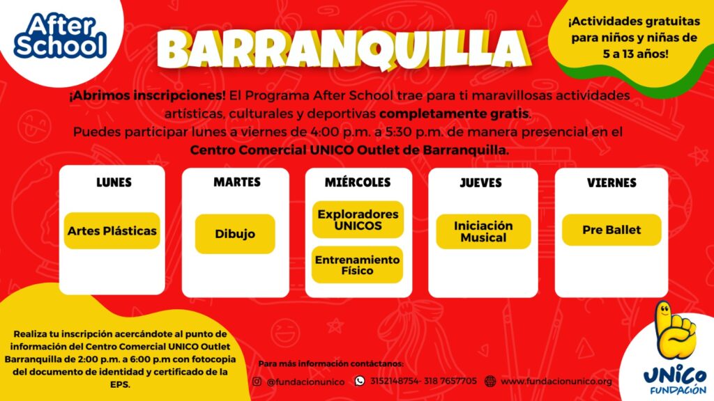 La Fundación UNICO anunció la apertura de inscripciones para su programa After School en la ciudad de Barranquilla, ofreciendo actividades artísticas, culturales y deportivas completamente gratuitas para niños y niñas de 5 a 13 años durante el año 2026.