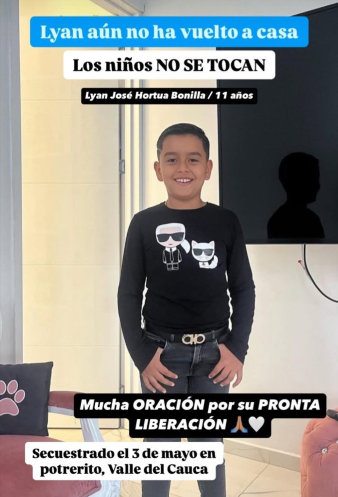 “#LiberenALyan, nuestro niño de 11 años, quien fue secuestrado desde el 3 de mayo en Jamundí, Valle del Cauca. Aún está en cautiverio por las disidencias de alias Mordisco, estructura Jaime Martínez, cuyo cabecilla criminal es alias Marlon. Este acto inhumano, vil y cobarde contra un menor de edad es un crimen que hiere a Colombia entera. Exigimos su liberación inmediata. “, expresó el ministro Pedro Sánchez a través de su perfil en X.
