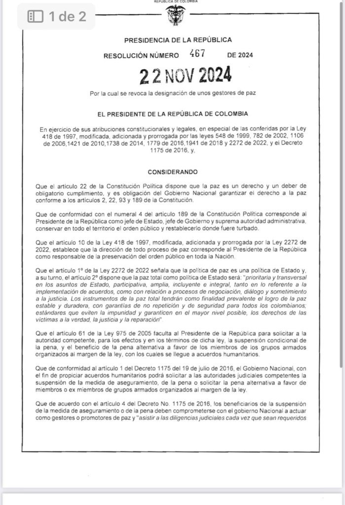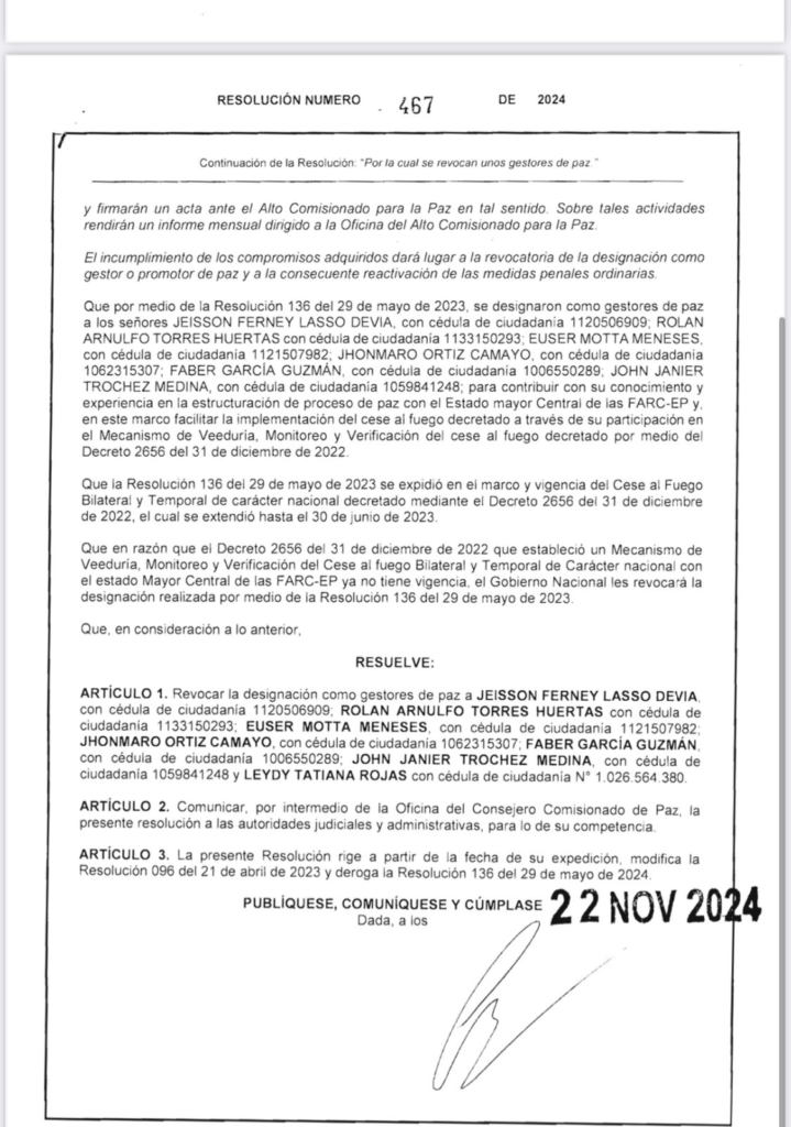 El Gobierno del presidente Gustavo Petro emitió la resolución 467 del 2024, en la que se determina revocar la designación como gestores de paz de siete disidentes de las FARC, algunos de ellos al mando de alias Iván Mordisco.