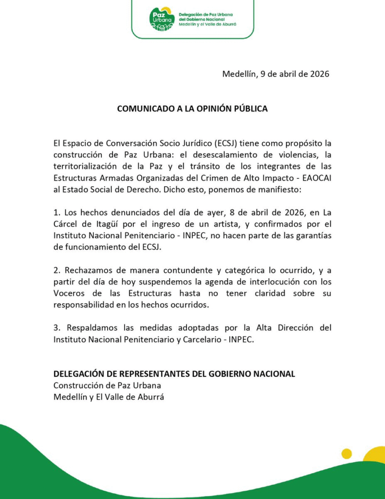 La Delegación de Paz Urbana del Gobierno nacional que mantiene un Espacio de Conversación Socio Jurídico (ECSJ) con cabecillas de estructuras criminales de Medellín y el Valle de Aburrá, decidió suspender el proceso tras el polémico acontecimiento.