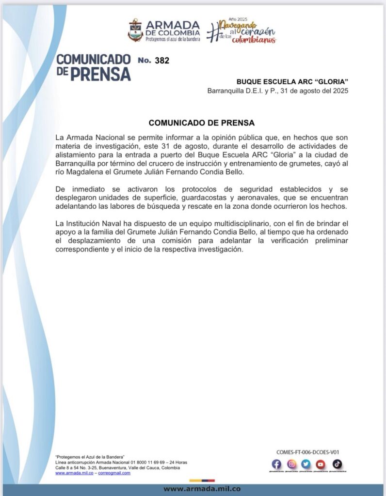 La Armada Nacional de Colombia confirmó que, en hechos que son materia de investigación, este domingo 31 de agosto, durante el desarrollo de actividades de alistamiento para la entrada al puerto de Barranquilla del Buque Escuela ARC “Gloria”, cayó al río Magdalena uno de sus tripulantes.