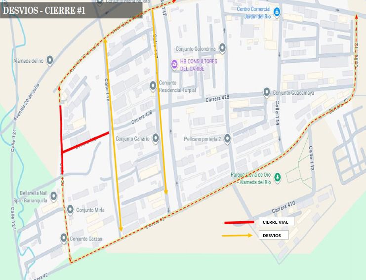 La Secretaría Distrital de Tránsito y Seguridad Vial informa a la ciudadanía que se ha programado un cierre temporal en un sector de Alameda del Río, desde este lunes 24 de noviembre hasta el 31 de diciembre por trabajos de instalación de redes de drenaje de aguas lluvias, en los tramos de la calle 120 entre carreras 42B y 43, y carrera 42B entre calles 120 y 118.