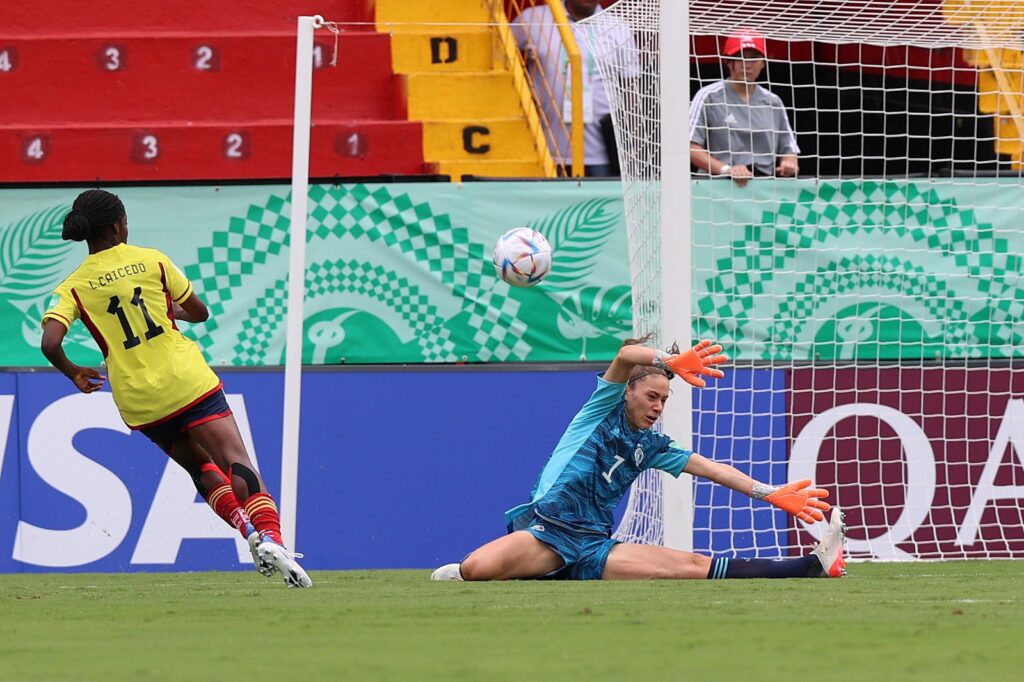 Las mujeres alemanas, si bien manejaron la tendencia ofensiva durante esa primera etapa pero sin profundidad, solo pudieron llegarle con claridad a su primer rival en este cuadrangular B en un contragolpe, nacido tras la jugada que desperdició Caicedo y que terminó en un potente remate cruzado de media distancia, el cual evitó que vulnerara su red la guardameta Natalia Giraldo, estirándose de manera fenomenal y mando la esférica al tiro de esquina.