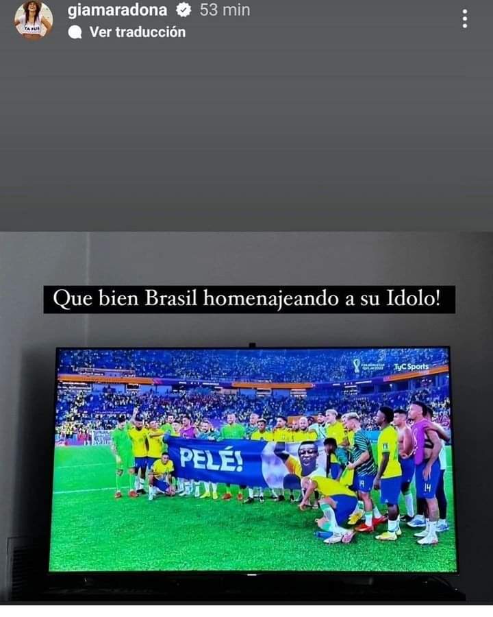 Fiel a su estilo, la hija del 10 argentino, de quien millones de futboleros más aseguran es el mejor de todos los tiempos, al parecer, se indignó al ver que los jugadores de la Canarinha desplegaron dicha pancarta en honor a Pelé, mientras que, por ahora, los futbolistas del equipo que dirige Lionel Scaloni no han hecho lo mismo con su padre.