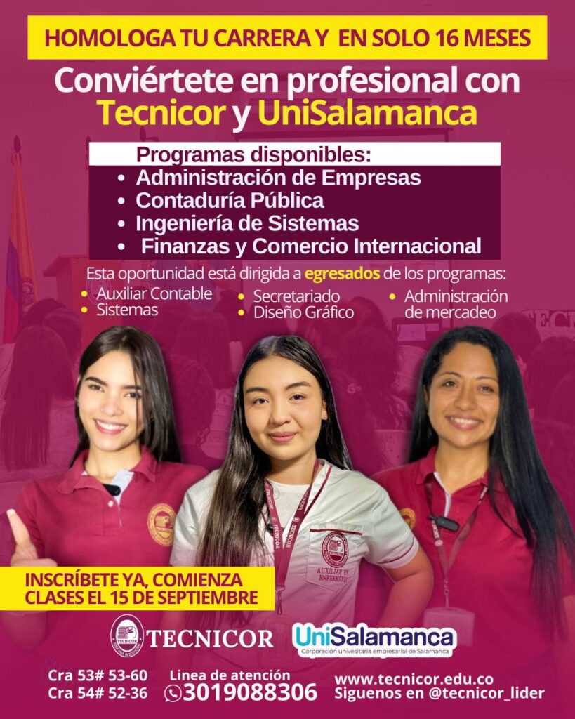 Tecnicor, en alianza con la Corporación Universitaria Empresarial de Salamanca (UniSalamanca), lanza una excelente alternativa para quienes desean homologar sus estudios y convertirse en profesionales en tiempo récord: solo 16 meses.