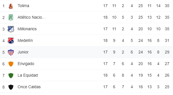 Hasta el momento hay cuatro clasificados a los cuadrangulares: el líder Tolima, que suma 35 puntos; Atlético Nacional, segundo también con 35; Millonarios que figura como tercero, al reportar igualmente 35; y Medellín, cuarto con los 31 que hizo ayer.