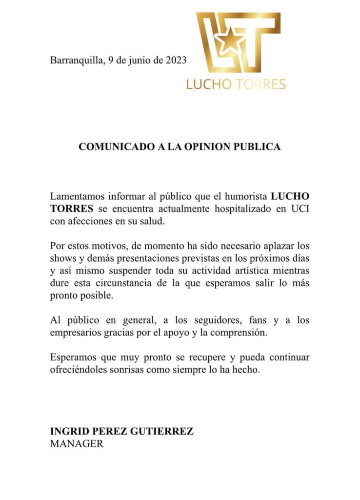 “Lamentamos informar al público que el humorista Lucho Torres se encuentra actualmente hospitalizado en UCI con afecciones en su salud. Por estos motivos, de momento ha sido necesario aplazar los