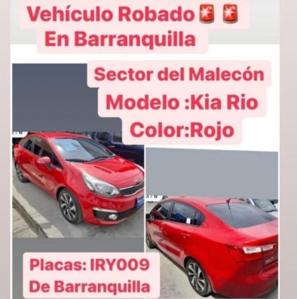 Lo que estaba siendo una velada maravillosa en familia se convirtió para una mujer, su esposo e hijas en un momento desagradable, víctimas de la delincuencia que les arrebató su vehículo Kia Río de placa IRY009, modelo 2016.