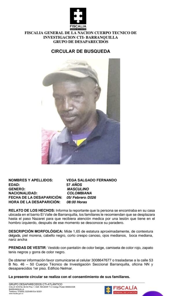 De obtener información sobre la ubicación de Fernando Vega, la ciudadanía puede comunicarse al celular 3008647677 o trasladarse a la calle 53B No. 46-50, Cuerpo Técnico de Investigación Seccional Barranquilla, oficina NN y desaparecidos, primer piso, edificio Nelmar.