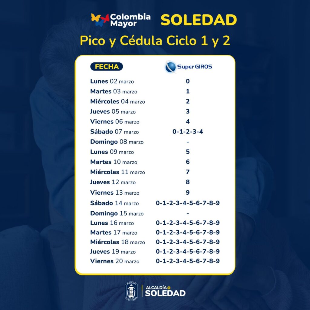 La Alcaldía de Soledad, en articulación con el Departamento Administrativo para la Prosperidad Social, informa a los beneficiarios del programa Colombia Mayor el inicio de pagos a partir de este lunes 2 de marzo, correspondientes a los ciclos 1 y 2 del presente año, los cuales se realizarán mediante la modalidad de giro a través de la red autorizada de SuperGIROS.