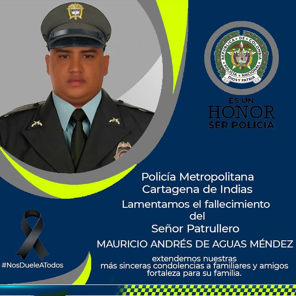 A las 9:50 p. m. de este martes se produjo el deceso del patrullero Mauricio Andrés de Aguas Méndez, de 32 años, quien estaba adscrito al GOES, Grupo de Operaciones Especiales, de la Policía de Cartagena, en el barrio Manga.