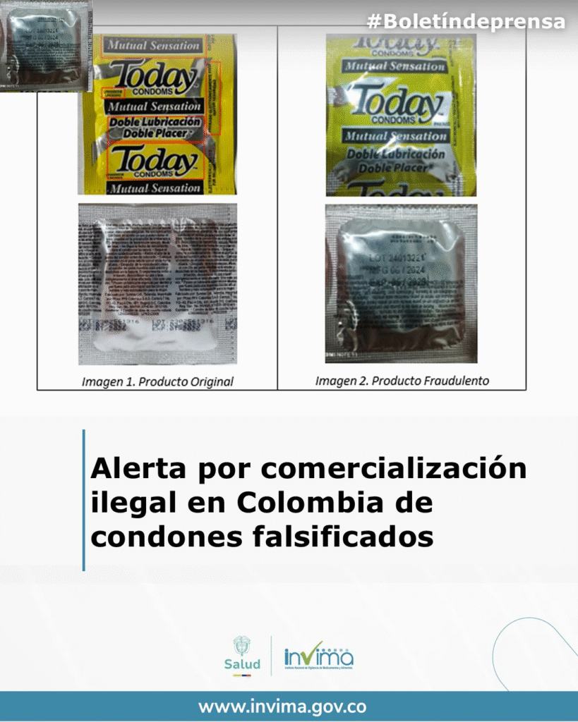 El Instituto Nacional de Vigilancia de Medicamentos y Alimentos – Invima, en atención a lo denunciado por el titular e importador del registro sanitario HALEON COLOMBIA S.A.S., generó una advertencia a la ciudadanía sobre la comercialización ilegal de condones falsificados de la marca “Today Mutual Sensation”, los cuales estarían circulando en el país y “representan un riesgo potencial para la salud y la seguridad sexual de los consumidores“.