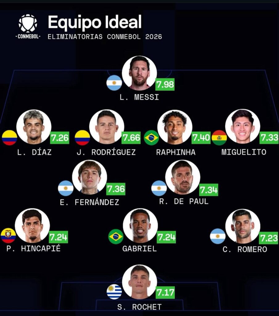 Luis Díaz, con una calificación de 7.26, y James Rodríguez, con una de 7.66, integraron el listado de los once mejores del certamen Conmebol y en el que figuró como delantero el mejor jugador del mundo para muchos y quien se hizo al ‘Botín de goleador’, el argentino Lionel Messi.