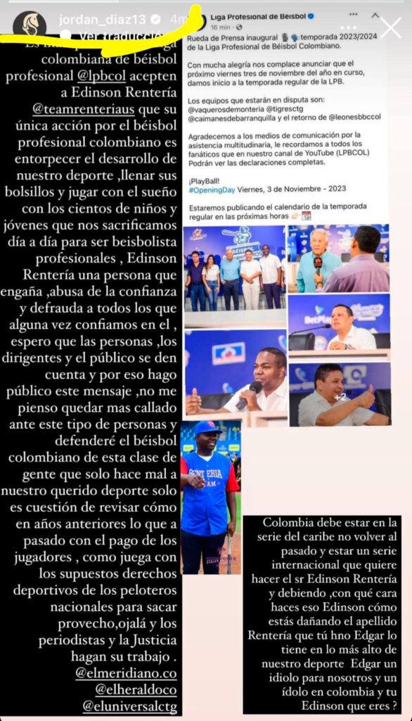 En una historia en su cuenta Instagram pero sin exponer detalles contundentes del por qué de su acusación, el pelotero monteriano, quien juega para la organización del béisbol de los Estados Unidos, Atléticos de Auckland, sostuvo que Édinson lo que hace es “entorpecer el desarrollo de nuestro deporte, se llena sus bolsillos y juega con los sueños de niños y jóvenes que nos sacrificamos día a día para ser beisbolistas profesionales”, señaló en un extenso escrito.