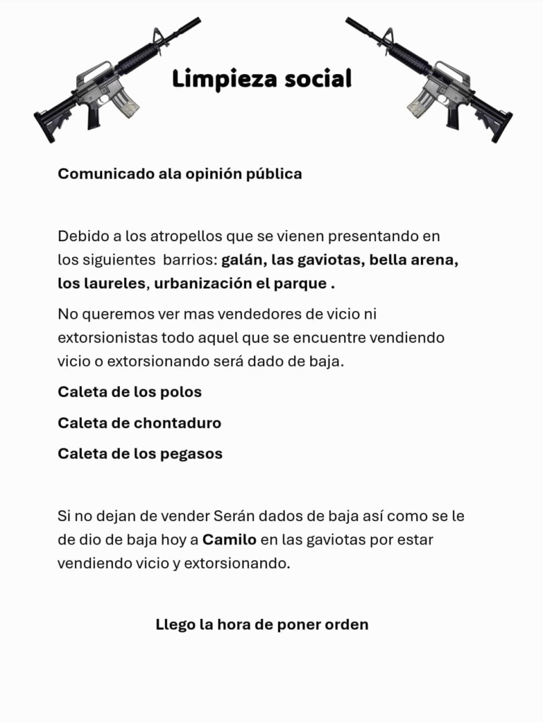 En esa línea, en redes sociales ha circulado un panfleto amenazante en el que anuncian una “limpieza social” en algunos barrios como Galán, Las Gaviotas, Bella Arena, Los Laureles, urbanización el parque. En el pasquín mencionan a la víctima y se atribuyen el asesinato.