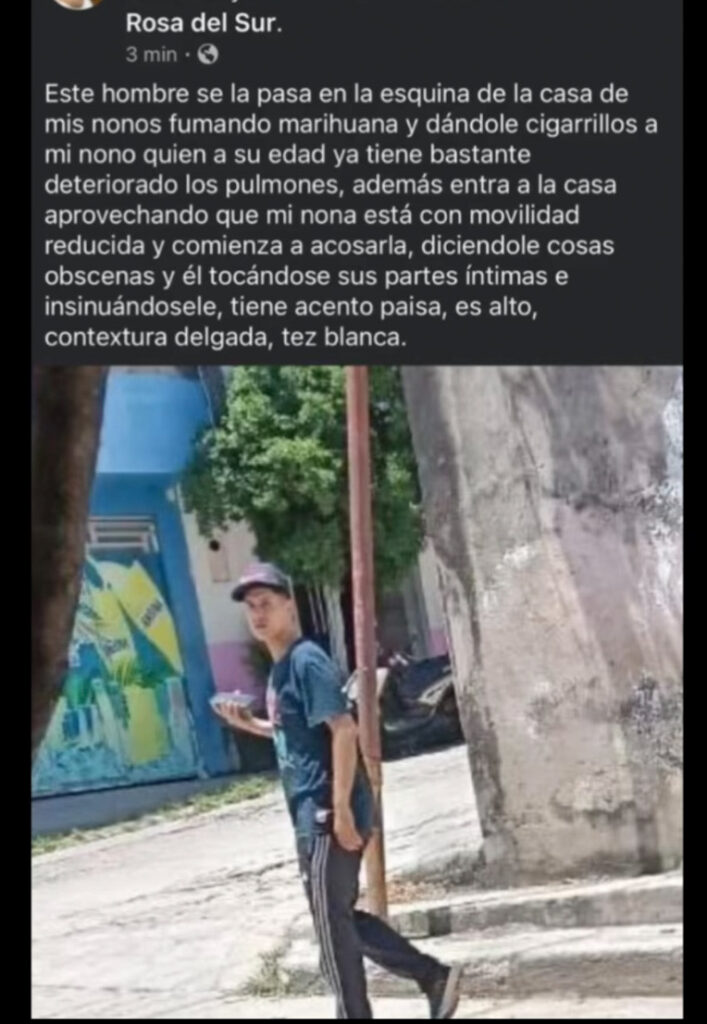 “Este hombre se la pasa en la esquina de la casa de mis nonos fumando marihuana y dándole cigarrillos a mi nono quien a su edad ya tiene bastante deteriorados los pulmones, además entra a la casa aprovechando que mi nona está con movilidad reducida y comienza a acosarla, diciéndole cosas obscenas y él tocándose sus partes íntimas e insinuándosele, tiene acento paisa, es alto, contextura delgada, tez blanca”, dijo la mujer.