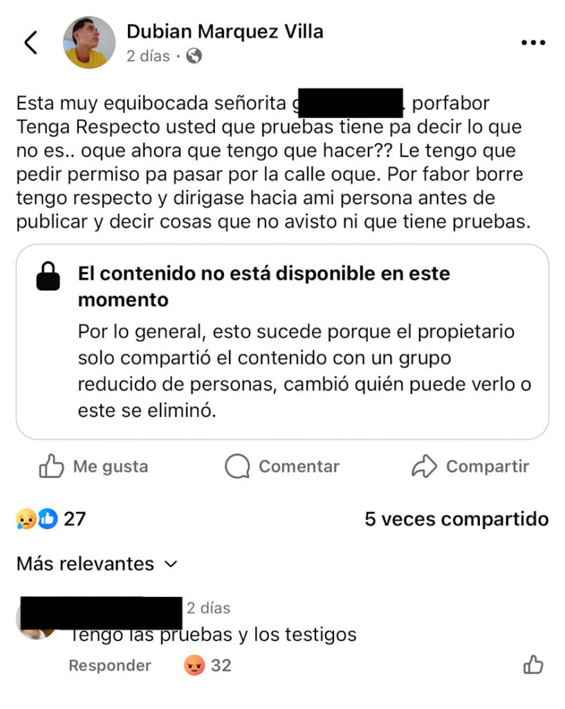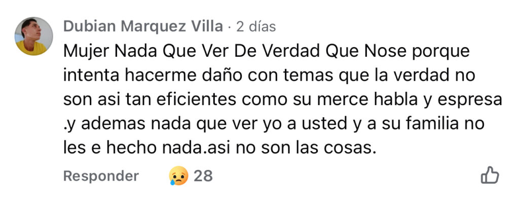La mujer restringió su perfil en la red social; mientras, varias personas lamentan la muerte de Dubian, expresando: “Qué injusticia se cometió con usted, amigo, excompañero de trabajo. Dios te tenga en su santo reino y justicia para las personas que te arrebataron la vida”, “Ojalá Dios permita que se haga justicia, conozco a la familia y son muy buenas personas, él era un buen muchacho, me duele porque hay una familia que hoy llora su ser querido por una persona mentirosa e irresponsable”.