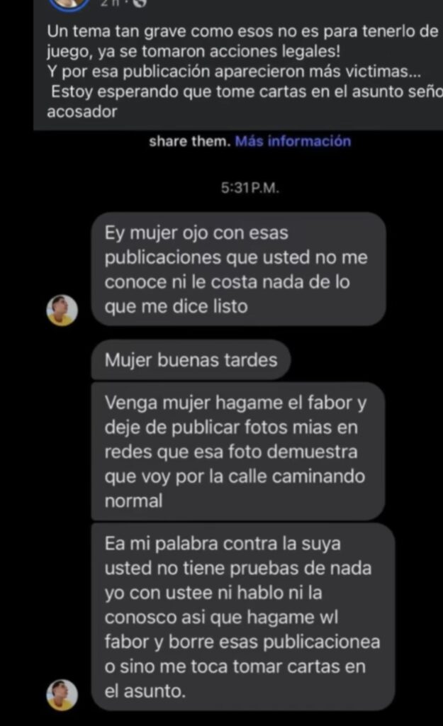 En las conversaciones entre ambos quedó evidenciado cómo el hombre le pedía a la usuaria de Facebook no subir imágenes de él y se defendía ante las acusaciones; sin embargo, ella publicó dichos mensajes asegurando que el tema no era un juego y que ya había tomado acciones legales.
