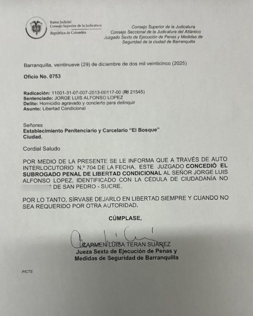 Una decisión sorpresiva ha sido revelada este 30 de diciembre. La jueza sexta de Ejecución de Penas y Medidas de Barranquilla, Carmen Luisa Terán Suárez le concedió la libertad condicional a Jorge Luis Alfonso López, hijo de la fallecida empresaria del chance Enilce López.