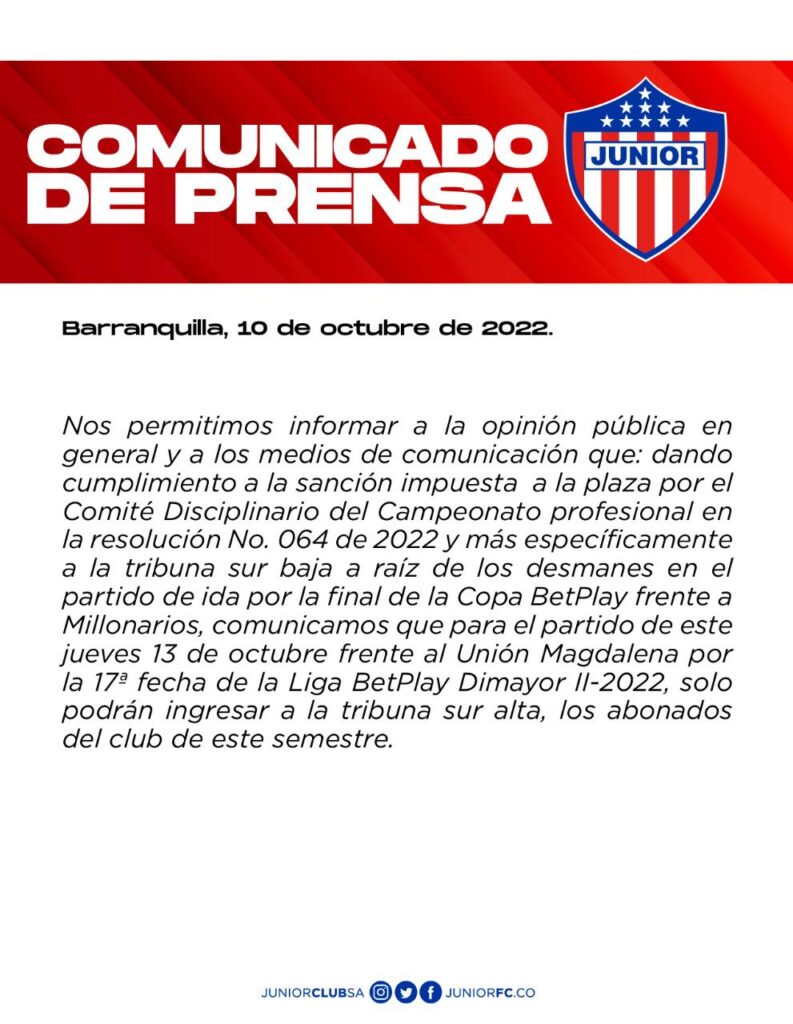 En el más reciente comunicado emitido por la institución barranquillera, se informó que conforme a la sanción impuesta a la tribuna Sur Baja como consecuencia de los hechos violentos entre ‘barristas’ rojiblanco en la final de Copa Betplay contra Millonarios, para el partido ante Unión Magdalena solo podrán ingresar a la gradería Sur Alta los abonados del club de este semestre.