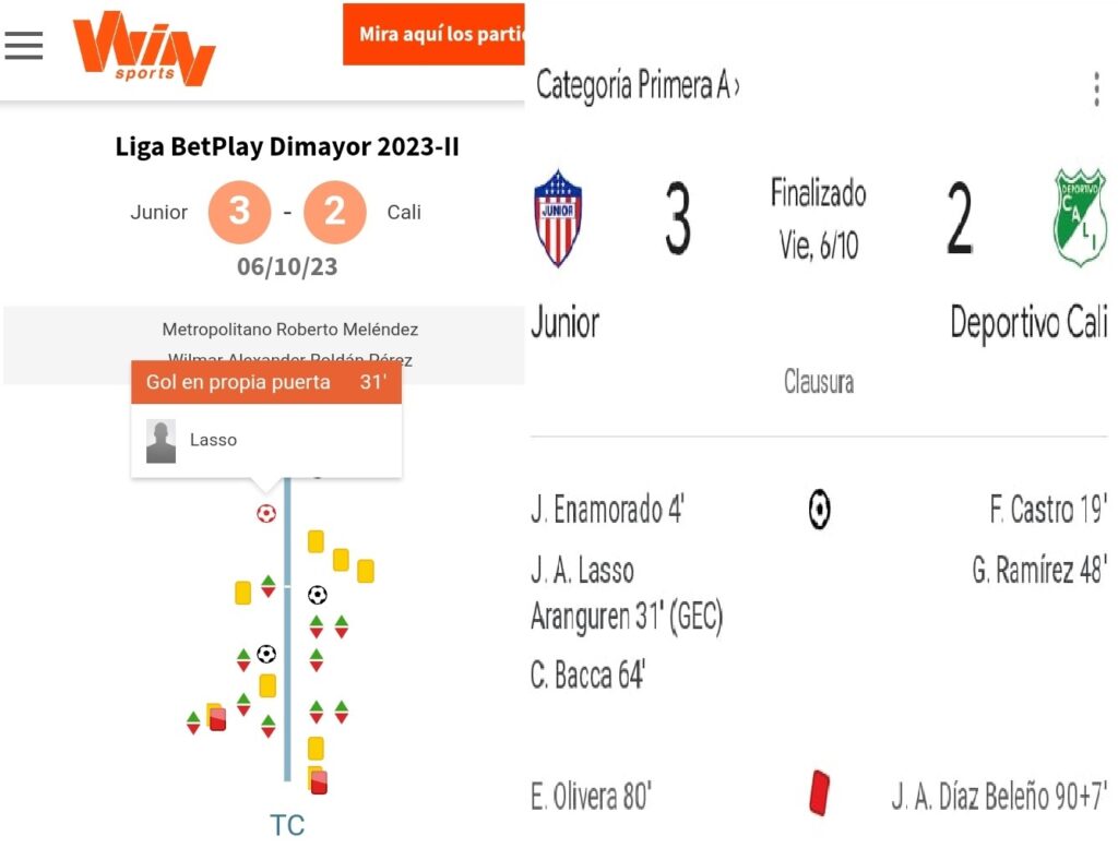 No obstante, es la hora que ni en la cadena televisiva que tiene los derechos de transmisión de los partidos del fútbol profesional colombiano, Win Sports, así como otras páginas que en sus informaciones manejan las estadísticas de los compromisos, han cambiado el nombre del anotador de ese dos-uno parcial. Continúa apareciendo como el facturador de esa diana, provocada al minuto 31, el nombre del defensor del Cali, Jhildrey Lasso.