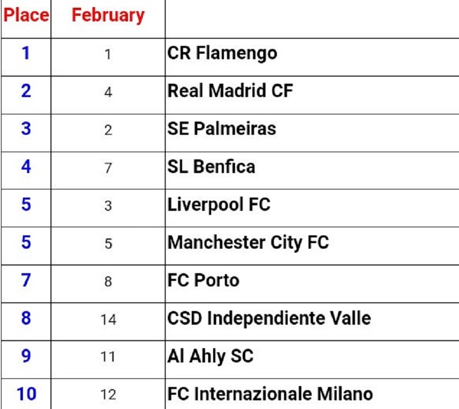 Dos sudamericanos, más precisamente del fútbol brasileño, se encuentran en el podio: Flamengo, actual campeón de la Copa Libertadores, es el primero, superando al vigente rey de la Champions League, Real Madrid, que es segundo. En el tercer escalón aparece Palmeiras de Brasil.