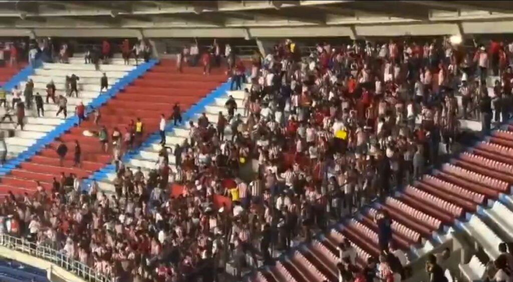 Notándose en cancha a un Tiburón saboreando el primero con la movilidad por banda izquierda del pequeñín Deiber Caicedo, bordeando el minuto 10, unos desmanes suscitados tras una fuerte explosión en la tribuna sur, al parecer provocados por miembros de la ‘barra brava’ del Junior que se ubican ahí y quienes se enfrentaban entre sí, obligó a que se suspendiera el compromiso de forma momentánea.