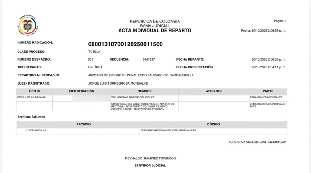Sigue la tensión en la Universidad del Atlántico tras la designación de su nuevo rector, Leyton Barrios: en las últimas horas, el Juzgado Penal Especializado 001 de Barranquilla, a cargo del juez Jorge Torregrosa Monsalve, admitió para trámite la acción de tutela interpuesta por Willian Moreno contra la institución, por incurrir, presuntamente, en la “vulneración de los derechos fundamentales al acceso a la información pública, la transparencia, la participación y el control ciudadano”, dentro del proceso de elección del máximo dirigente de la UA.