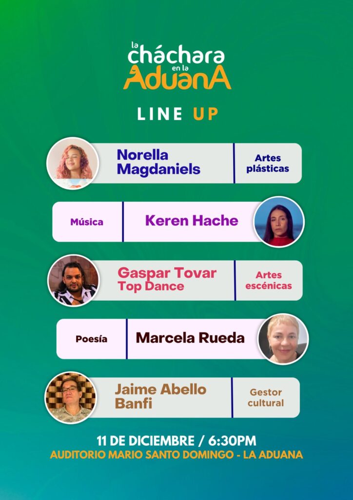 Este jueves 11 de diciembre, a las 6:30 p. m., en el Auditorio Mario Santo Domingo de La Aduana, se realizará la tercera versión de La Cháchara en La Aduana. El exitoso talk show reunirá a destacados artistas de la música, la poesía, la danza y las artes plásticas, en un formato de arte en vivo que se ha convertido en referente cultural de Barranquilla.
