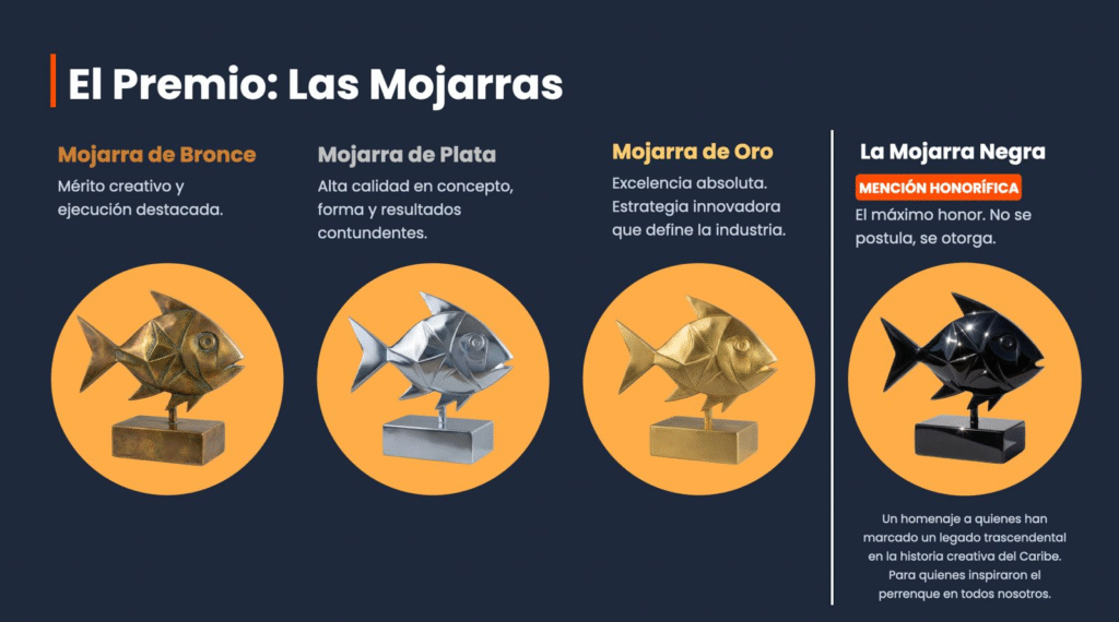 El eje del certamen es el perrenque, definido como una mezcla de ingenio y autenticidad caribe que permite ejecutar proyectos ambiciosos con impacto real para las marcas, proyectos y comunidades. El símbolo de reconocimiento es, precisamente, la mojarra, figura tradicional del Caribe y emblema de fortaleza, capaz de sobrevivir en agua dulce y salada.