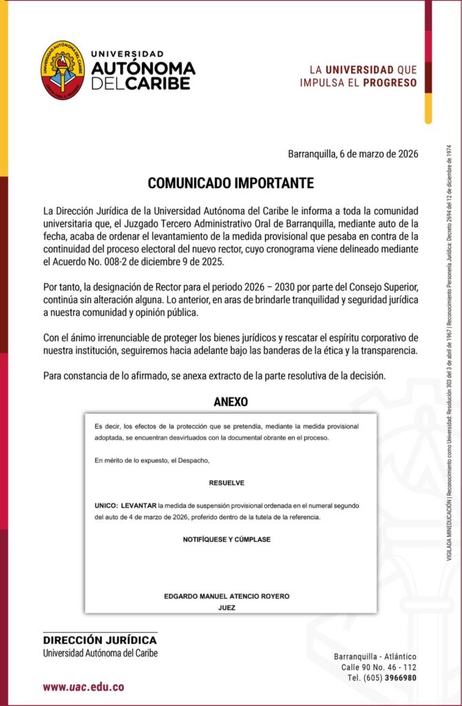 La Dirección Jurídica de la Universidad Autónoma del Caribe le informa a toda la comunidad universitaria que, el Juzgado Tercero Administrativo Oral de Barranquilla, mediante auto de la fecha, acaba de ordenar el levantamiento de la medida provisional que pesaba en contra de la continuidad del proceso electoral del nuevo rector, cuyo cronograma viene delineado mediante el Acuerdo No. 008-2 de diciembre 9 de 2025.