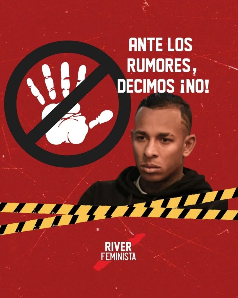En el texto emitido por dicho movimiento, ‘River Feminista’ precisó que una eventual incorporación del jugador antioqueño iría en contra de los valores institucionales y de los protocolos de género vigentes en el club, diseñados para prevenir y erradicar la violencia dentro del ámbito deportivo.