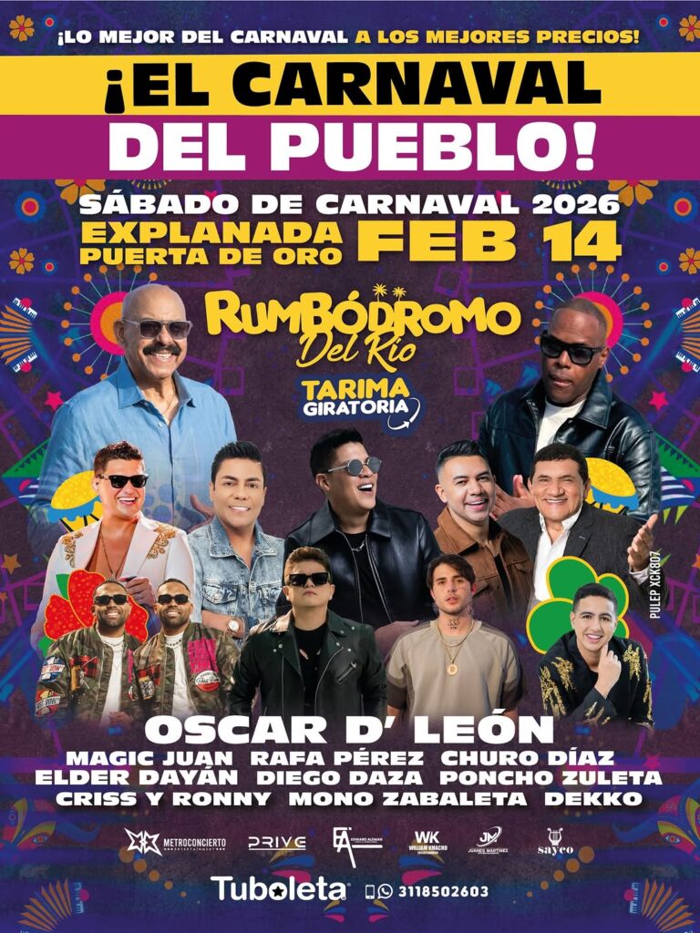 Con boletas desde $63.000, el Rumbódromo del Río ha sido concebido como el llamado “concierto del pueblo”, una propuesta incluyente que apuesta por la diversidad de ritmos y públicos. Vallenato, salsa, bachata y reguetón se darán cita en una jornada pensada para que barranquilleros y visitantes disfruten de la esencia festiva del Carnaval de Barranquilla a orillas del río Magdalena.