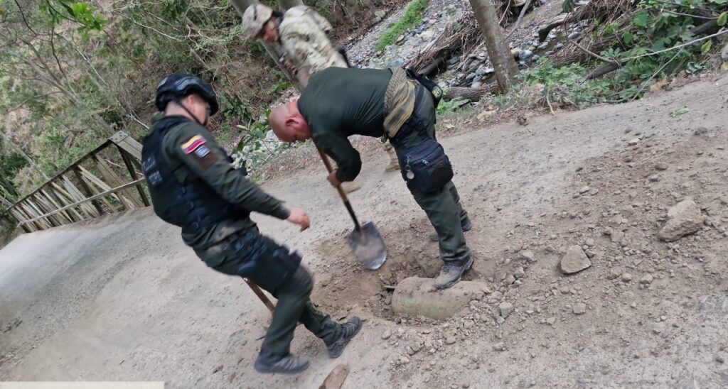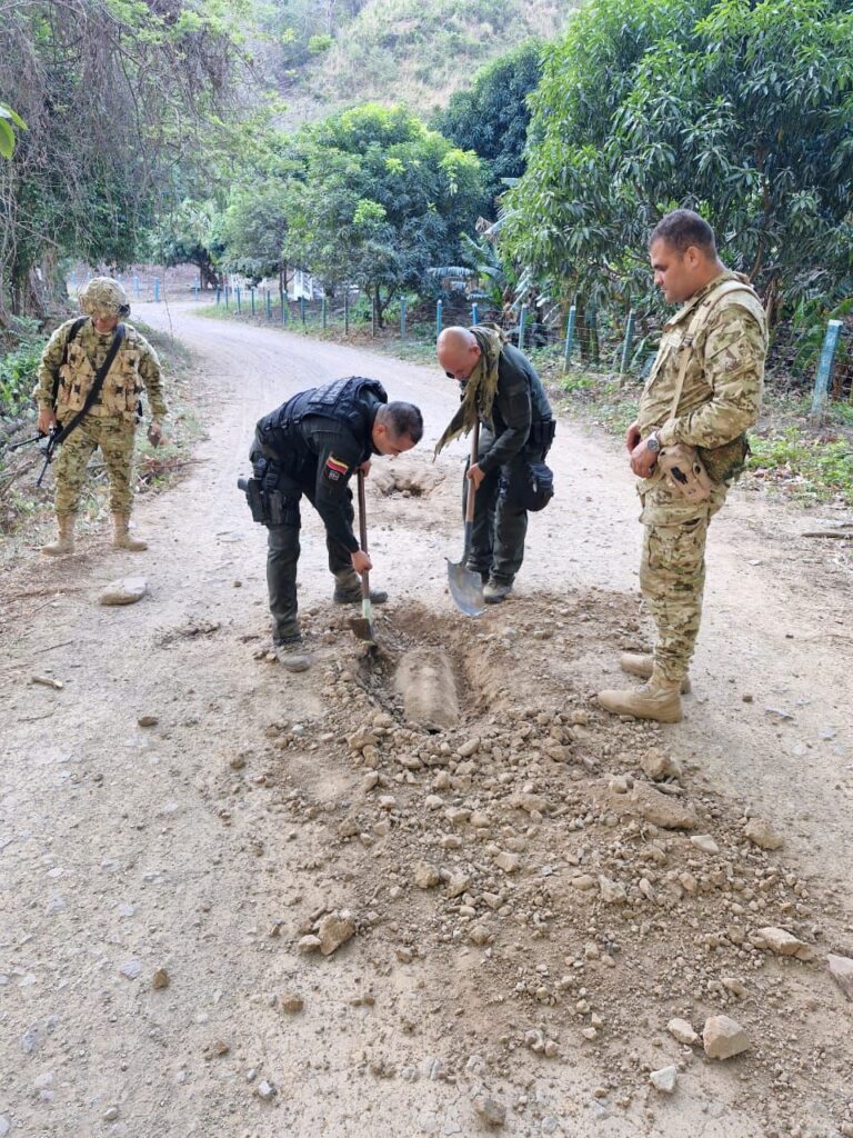 “Durante la intervención, se identificaron dos artefactos explosivos improvisados, uno de ellos, un artefacto para gas GLP de 40 libras con un sistema de activación por cable. A solo dos metros de este, se halló otro artefacto con características similares, conectado en serie a una línea de mando que se extendía a 100 metros hacia la zona montañosa”, indicó el coronel Eduardo Chamorro Pinzón, comandante del Departamento de Policía Cesar.