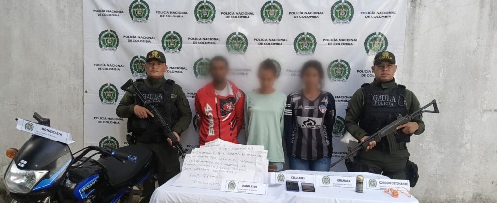 “Gracias a la información oportuna suministrada por la comunidad, la Policía Nacional logró la captura en flagrancia de tres personas, dos mujeres y un hombre en el municipio de Pivijay Magdalena, estos presuntos delincuentes se movilizaban en motocicleta por el sector comercial entregando panfletos amenazantes alusivos al grupo delincuencial común organizado los Primos”, dijo el coronel Javier Alberto Duarte Reyes, comandante Departamento de Policía Magdalena.