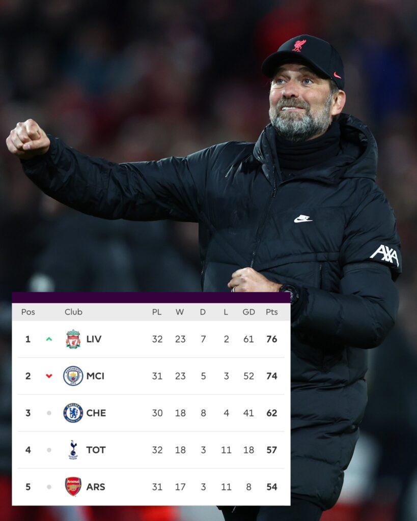 Pues bien, con su categórica victoria de ayer ante United, los “Reds” se ubicaron primeros en la tabla de posiciones, tras sumar 76 puntos, desplazando de forma parcial de ese puesto al Manchester City, que ahora es segundo con 74.