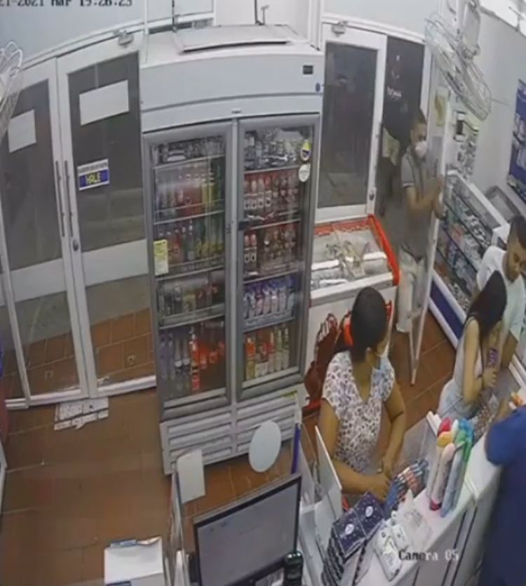 En las imágenes se ve el momento en que uno de los hombres, quien iba vestido con una camisa tipo Polo, de rayas negras y blancas, bermuda color beige y tenis blancos, entró al lugar sacando el arma con que intimidó a Vega.