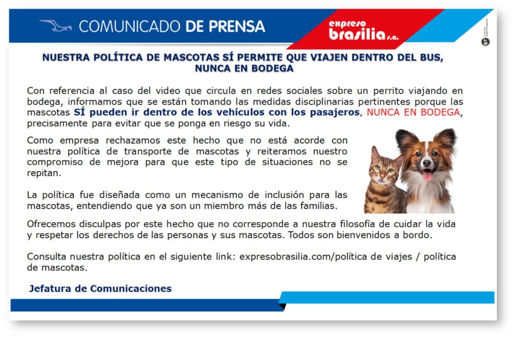 Este lunes 18 de septiembre la empresa se pronunció sobre el hecho que, al parecer, ocurrió el pasado viernes, asegurando que tomará las medidas disciplinarias necesarias dado que para evitar poner en riesgo la vida de los animales, su política sí permite que estos viajen dentro de los vehículos con los pasajeros: