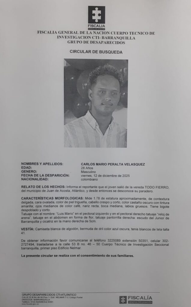 La justicia sigue su curso y las investigaciones avanzan en el caso de Carlos Mario Peralta Velásquez, joven de 28 años que desapareció el 12 de diciembre de 2025 tras salir de su casa en la vereda Todo Fierro del municipio de Juan de Acosta, Atlántico, rumbo a Barranquilla, con la excusa de ir a ver el partido de Junior contra Tolima.
