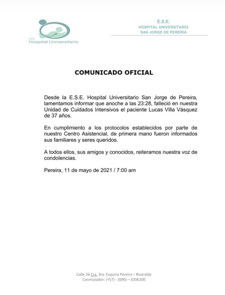 “Desde la E. S. E. Hospital Universitario San Jorge de Pereira, lamentamos informar que anoche a las 23:28 falleció en nuestra Unidad de Cuidados Intensivos el paciente Lucas Villa Vásquez de 37 años”, informó la institución prestadora de servicios de salud.
