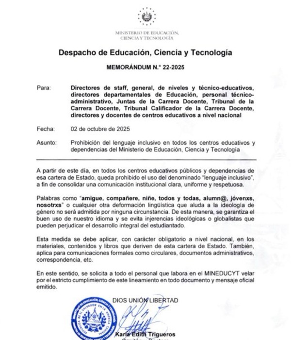 En una de esas ordenanzas muy aplaudidas por millones en El Salvador y en distintos países de Latinoamérica, por ejemplo Colombia, el presidente salvadoreño Nayib Bukele anunció por medio de un decreto la prohibición del lenguaje inclusivo en todos los colegios públicos de esa nación Centroamericana.