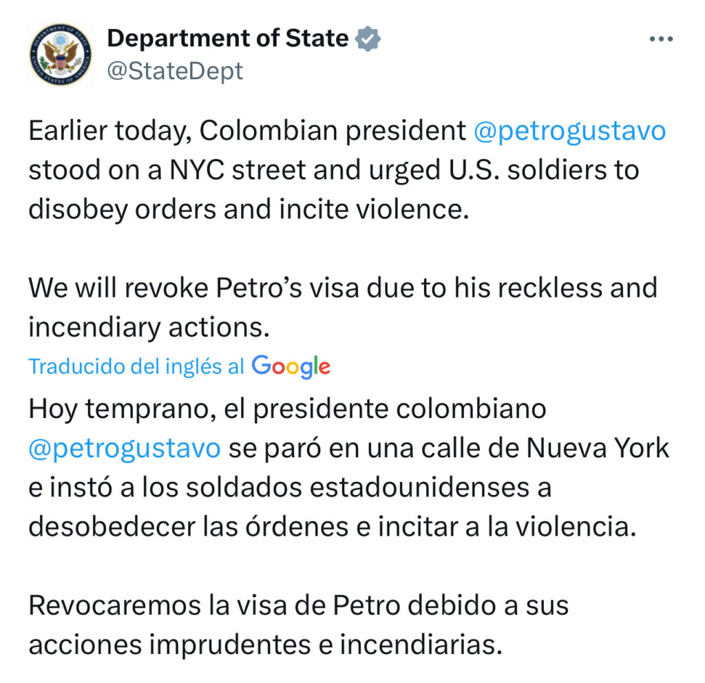 “El presidente colombiano @petrogustavo se paró en una calle de Nueva York e instó a los soldados estadounidenses a desobedecer las órdenes e incitar a la violencia. Revocaremos la visa de Petro debido a sus acciones imprudentes e incendiarias”, señaló el Gobierno norteamericano.