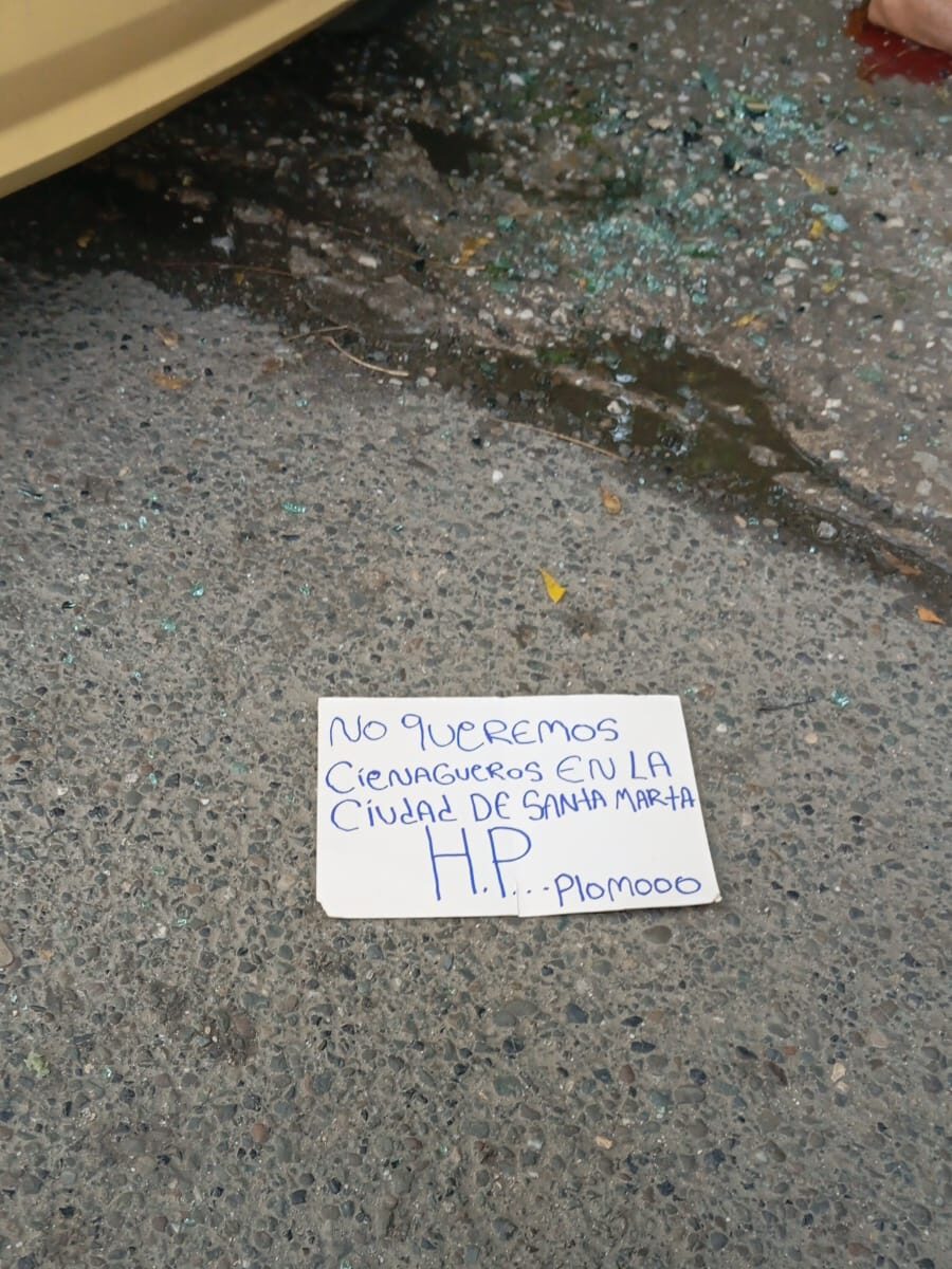 La gravedad del hecho no solo radica en el doble homicidio, sino en el mensaje dejado por los asesinos tras el crimen. De acuerdo con lo que se ha conocido, en el lugar fue hallado un papel con una amenaza explícita: “No queremos Cienageros en la ciudad de Santa Marta H*P.”